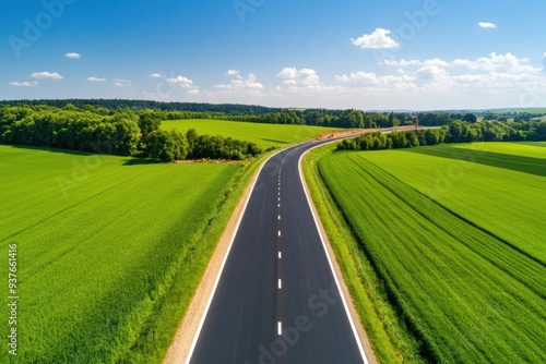 © Kunalai, Fototapeta premium Aerial view of a winding road surrounded by lush green fields under a bright blue sky with fluffy clouds.