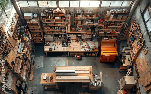 © BirD, Obraz premium Aerial view of a woodworking studio filled with tools and wooden materials. Creative workspace.