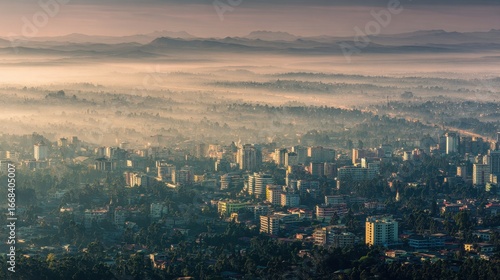 © SaroStock, Obraz premium Aerial view of addis ababa ethiopia at dawn with a road full of cars and some high rise buildings visible above the fog