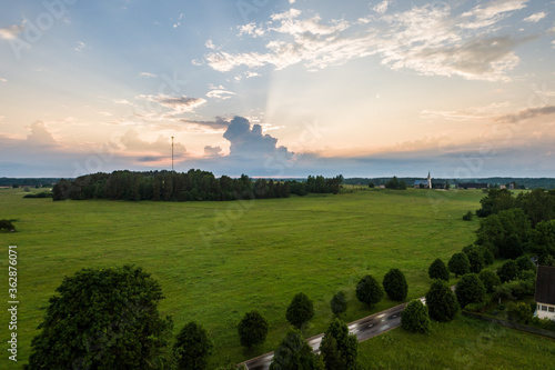 © nikwaller, Fototapeta premium Aerial view of amazing sunset at summer season. Nature landscape. Landscape surrounded by green fields, rivers and trees.