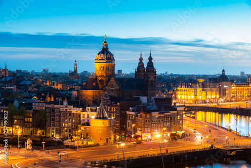 Fototapeta premium Aerial view of Amsterdam skyline in historical area at night in Amsterdam,...