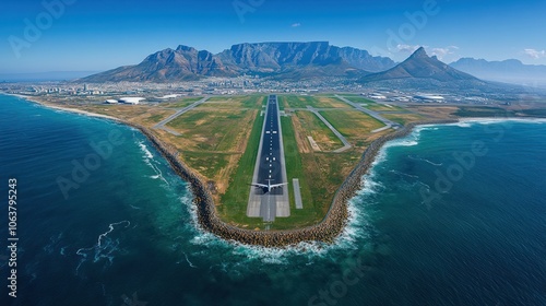 © azi, Fototapeta premium Aerial view of an airport runway with Table Mountain in the background.