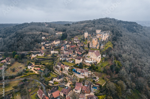 © Sen, Fototapeta premium Aerial view of an ancient medieval French village and Castelnaud-la-Chapelle Castle on the mountain in France