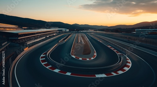 © OMD, Naklejka premium Aerial view of an empty motor racing circuit at sunset with surrounding mountains and stadium seating.
