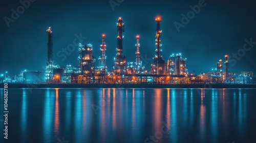 © Terablete, Naklejka premium Aerial view of an industrial complex illuminated by bright lights during nighttime operations in an urban area