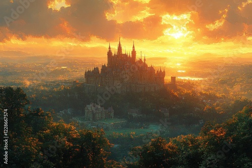 © zhuan, Naklejka premium Aerial View of Ancient Castle Surrounded by Lush Greenery at Sunset
