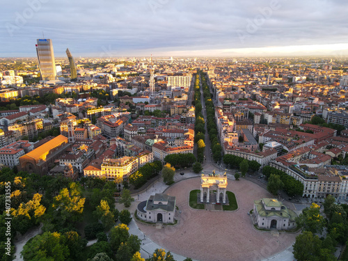 © AerialDronePics, Fototapeta premium Aerial view of Arco della Pace in Milano, north Italy. Drone photography of Arch of Peace in Piazza Sempione, near Sempione park in the heart of Milan, Lombardy and Sforza Castle.