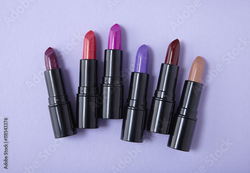 © beckystarsmore, Fototapeta premium Aerial view of assorted lip stick make up on a pastel purple background