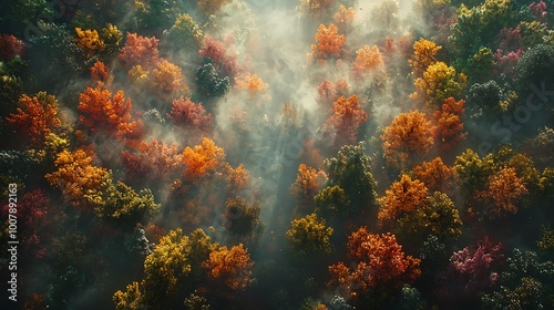 © FarhaStock, Fototapeta premium Aerial View of Autumn Forest with Fog and Sunlight