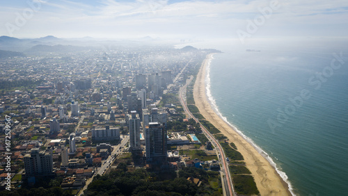 © Marcio Eneas, Fototapeta premium Aerial view of Balneário Piçarras coastline with full beachfront and cityscape.