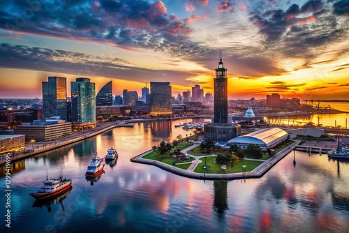 © Man888, Fototapeta premium Aerial View of Baltimore Inner Harbor Lighthouse at Sunset, Drone Photography