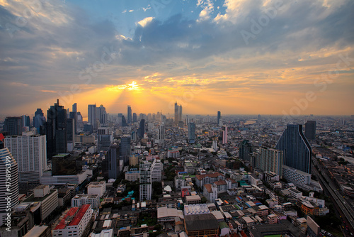 © Imaking, Fototapeta premium Aerial view of Bangkok modern office buildings, condominium, living place in Bangkok city downtown with sunset scenery, Bangkok is the most populated city in Southeast Asia.Bangkok , Thailand
