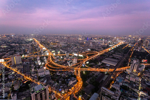 © Artha, Obraz premium Aerial view of Bangkok, Thailand at twilight, showcasing a vibrant cityscape with illuminated highways, modern buildings, and a glowing purple-pink sky. Captured using landscape photography