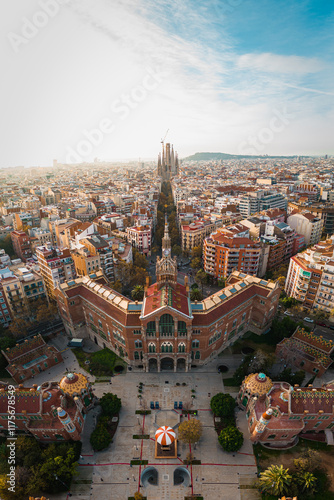 © Dimitris, Naklejka premium Aerial view of Barcelona and Sagrada Familia Basilica at sunrise. Catalonia, Spain