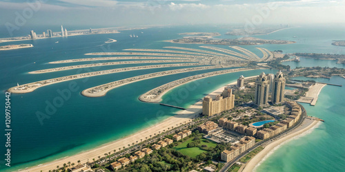 Fototapeta premium aerial view of beach, Aerial view of Dubai Palm Jumeirah island, United Arab...