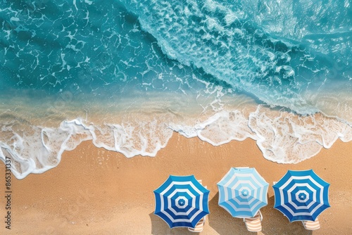 © Zhi_zhi_art, Naklejka premium Aerial view of Beach for summer vacation, swimming, and sunbathing on a sunny day. Top view of Summertime umbrellas