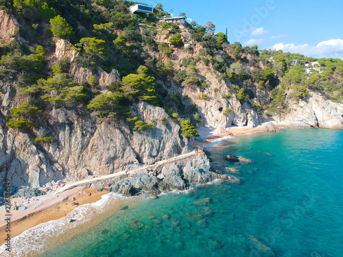 Fototapeta premium Aerial view of beautiful coastline in Mediterranean coast of Spain, Costa Brava. Panorama of Rocks on the coast in beautiful summer day. Beautiful beach with turquoise sea, holiday destination