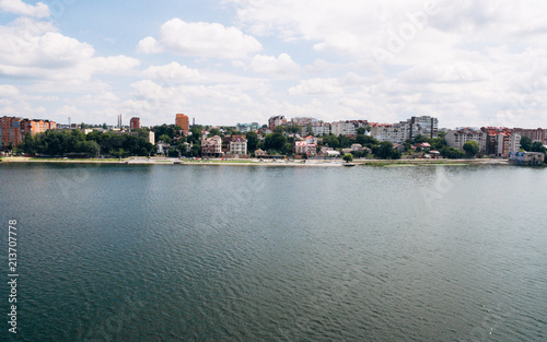 © TrEKone, Naklejka premium Aerial View of beautiful green city, the embankment and the blue lake against the blue sky and white clouds. Ternopil. Ukraine