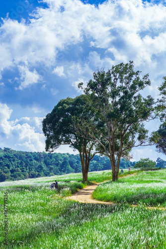© Thananchanok, Obraz premium Aerial view of beautiful rural landscape with green and white glass flower fields and trees under a sunny blue sky, National park, Thailand.