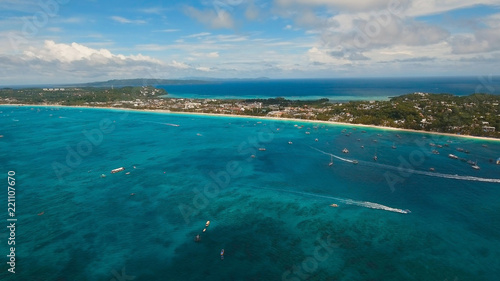 © Alex Traveler, Obraz premium Aerial view of beautiful tropical island with white sand beach, Boracay, hotels and tourists. Tropical lagoon with turquoise water and white sand. Beautiful sky, sea, beach, resort. Seascape: Ocean