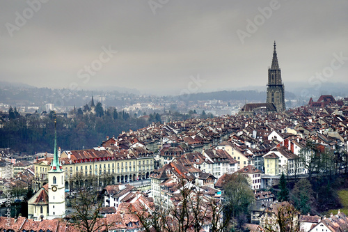 © Xiaodong, Naklejka premium Aerial view of Bern old town with iconic church tower