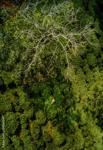 © CravenA, Fototapeta premium Aerial view of Bien Ho Che or Bien Ho tea fields, Gia Lai province, Vietnam. Workers of the tea farm are harvesting tea leaves in the early morning.