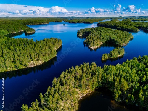© nblxer, Fototapeta premium Aerial view of blue lakes and green forests on a sunny summer day in Finland.