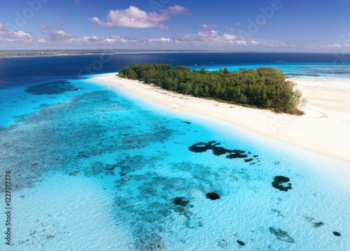 Obraz premium Aerial view of blue sea and amazing Mnemba island, Zanzibar. Top drone view...
