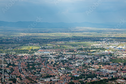 © Roberto Sorin, Fototapeta premium Aerial view of Brasov surrounded by the Carpathian mountains dotted with ski resorts including the ever popular Boiana Brasov. Romania, the Balkans, Eastern Europe