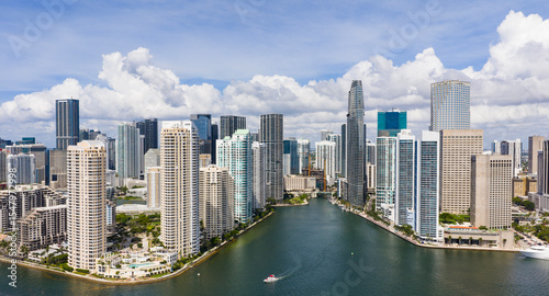 © be free, Fototapeta premium Aerial view of Brickell skyscrapers. Modern cityscape of downtown Miami. Panoramic Miamis skyline above the coastline. Brickell Key aerial view in Miami. Landscape of Miami. Miami Beach and Brickell.
