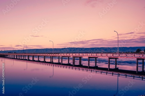 Obraz premium Aerial view of bridge over lake during sunset