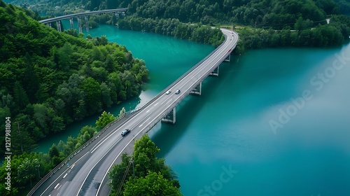 © MahmudulHassan, Fototapeta premium Aerial view of bridge road with cars and lake in the forest