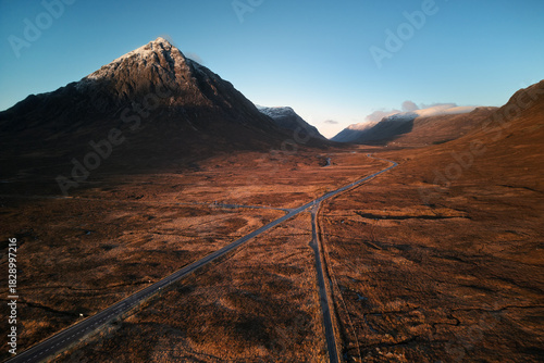 Naklejka premium Aerial view of Buachaille Etive Mor and the road through Glen Coe, Scotland. Dramatic mountain landscape, warm evening light, and vast moorland scenery in autumn. Natural landscape, no people
