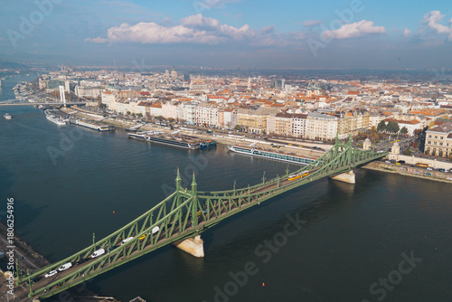 © JULIA, Fototapeta premium Aerial view of Budapest with Liberty Bridge and Danube river.
