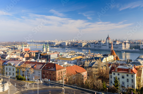 Naklejka premium Aerial view of Budapest with the Parliament and the Danube on a Sunny winter day, Budapest, Hungary