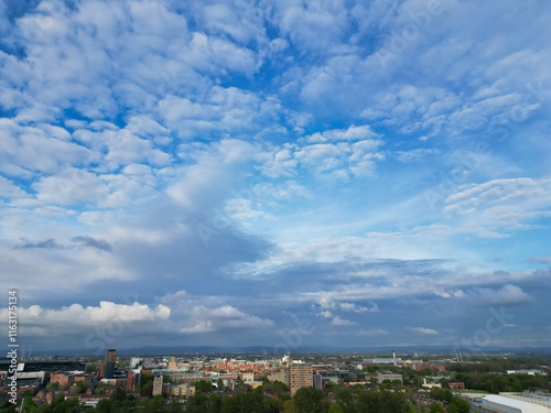 © Altaf Shah, Fototapeta premium Aerial View of Buildings at Greater Manchester Central City, Northwest of England, United Kingdom. Aerial View Footage Was Captured with Drone's Camera on May 4th, 2024 During Sunset Time.