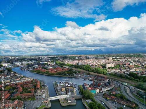 © Nasim, Fototapeta premium Aerial View of Buildings at Hotwells Central Bristol City of Southwest of England, Great Britain. High Angle Footage Was Captured with Drone's Camera from Medium High Altitude on May 27th, 2024.