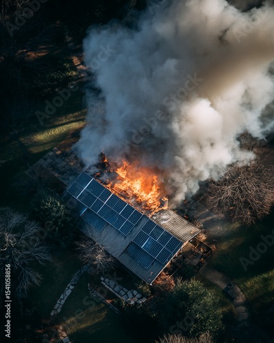 Obraz premium Aerial View of Burning House with Solar Panels