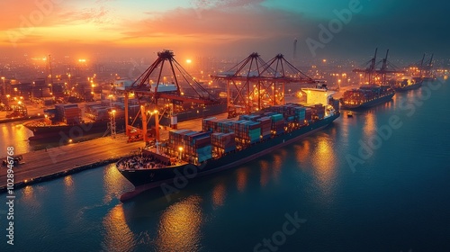 © Sunshine, Fototapeta premium Aerial View of Bustling Cargo Port at Sunset with Illuminated Cranes and Container Ships Reflecting on Calm Water Surface