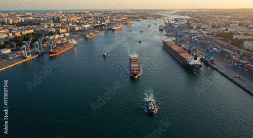 © Vistara , Naklejka premium Aerial View of Busy Shipping Port with Cargo Ships, Cranes, and Vibrant Cityscape During Sunset