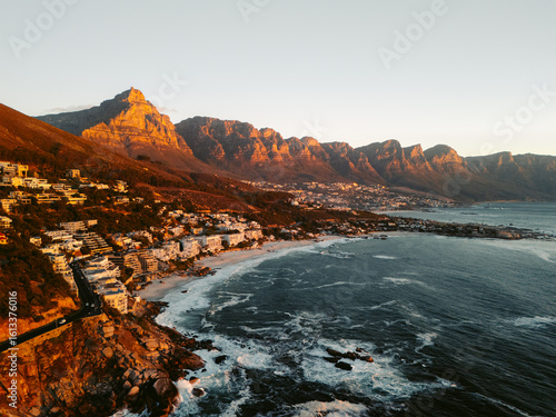 © Sergejs, Fototapeta premium Aerial View of Camps Bay, Cape Town at Sunset with Mountain Backdrop
