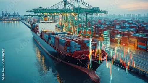 Fototapeta premium Aerial View of Cargo Ship Docked at Busy Port with Stacked Containers and...