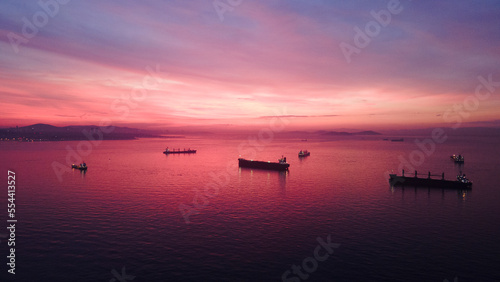Naklejka premium aerial view of cargo ships before sunrise in sea of marmara