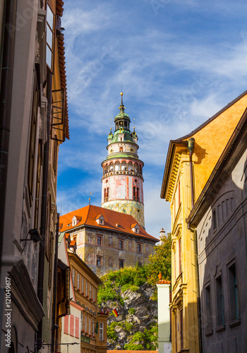 Fototapeta premium Aerial view of castle and houses in Cesky Krumlov, Czech republic. UNESCO...