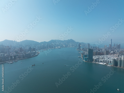 © YiuCheung, Naklejka premium Aerial view of central Hong Kong, China. Cityscape with skyscrapers lining the harbor under a clear sky. Urban scene showcasing the dense architecture and waterfront.