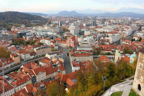 © jelena990, Obraz premium Aerial view of central Ljubljana, Slovenia during autumn.