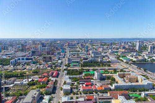 © Art Event, Fototapeta premium Aerial view of central part of modern city with skyscrapers and residential buildings. River and bridge on summer day.