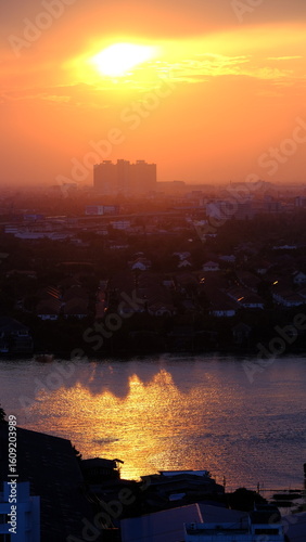 © PATTASUWANNAKORN, Fototapeta premium Aerial view of chao phraya river with landmark of Thailand, Sunset Atmosphere Along