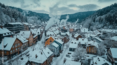 © Biancaart, Fototapeta premium Aerial View of Charming Winter Village Covered in Snow with Forest