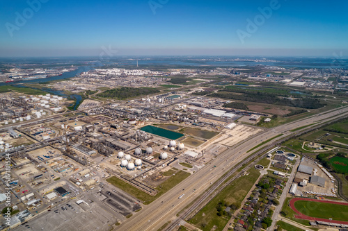 Fototapeta premium Aerial view of Chemical factory nearby Houston in Texas. Refinery is making gas and diesel for gas station and truck stops.